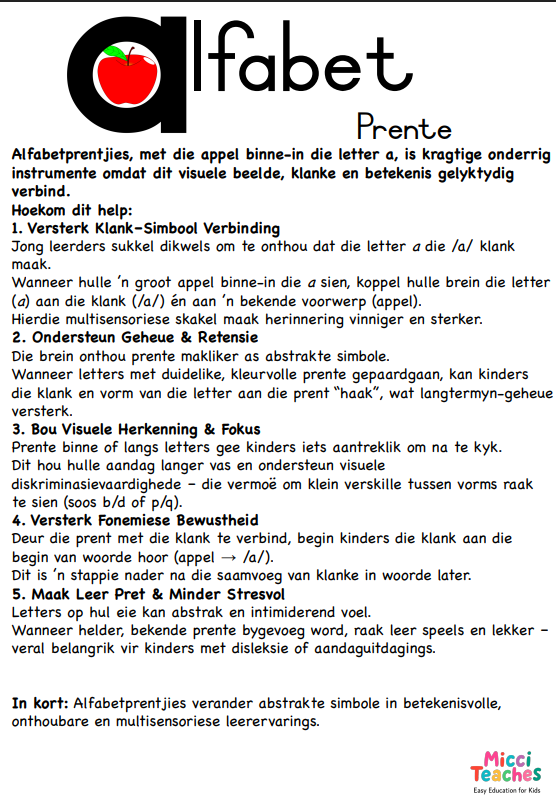 Alfabetprentjies verander abstrakte simbole in betekenisvolle, onthoubare en multisensoriese leerervarings. Prente skep ’n natuurlike brug tussen die letter en die klank. Wanneer ’n kind die prent sien en die woord sê, word die foniese klank direk aan die letter verbind. Prente aktiveer beide ouditiewe én visuele leerstyle. Dit beteken kinders leer nie net deur te hoor nie, maar ook deur te sien – en dit versterk geheue. Wanneer die alfabet nie net uit “droë letters” bestaan nie, maar uit prente wat kinders herken en liefhet, voel dit soos ’n speletjie – en leer gebeur vanself. Deur letters en prente te verbind, verstaan kinders gou dat letters simbole is wat woorde voorstel – die eerste tree na lees en skryf!