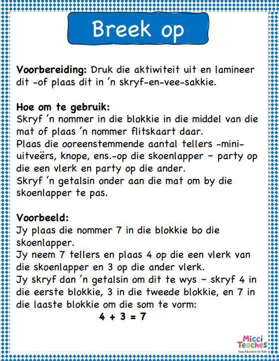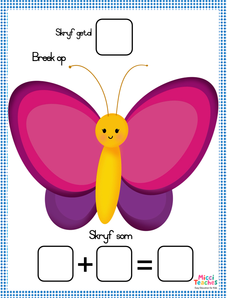 Plaas die getal 7 in die boks bo die skoenlapper. Neem 7 tellers en plaas 4 op die een vlerk van die skoenlapper en 3 op die ander vlerk. Nou skryf jy die som om dit te wys – skryf 4 in die eerste boksie, 3 in die tweede boksie, en 7 in die laaste boksie om die vergelyking te vorm: 4 + 3 = 7