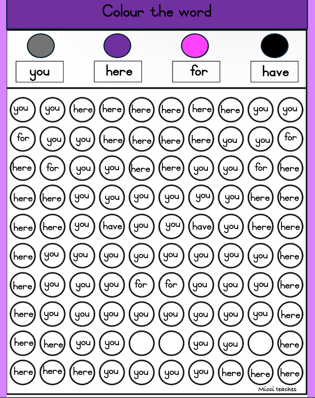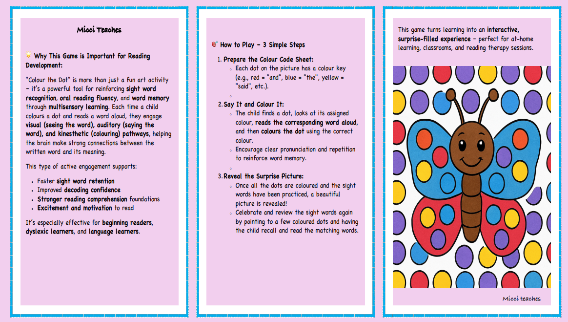“Colour the Dot” is more than just a fun art activity – it’s a powerful tool for reinforcing sight word recognition, oral reading fluency, and word memory through multisensory learning. Each time a child colours a dot and reads a word aloud, they engage visual (seeing the word), auditory (saying the word), and kinesthetic (colouring) pathways, helping the brain make strong connections between the written word and its meaning.