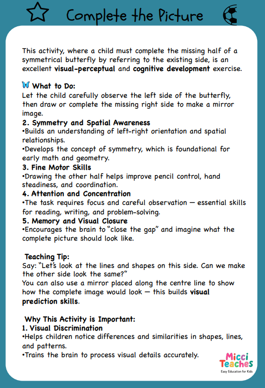 This activity, where a child must complete the missing half of a symmetrical butterfly by referring to the existing side, is an excellent visual-perceptual and cognitive development exercise.