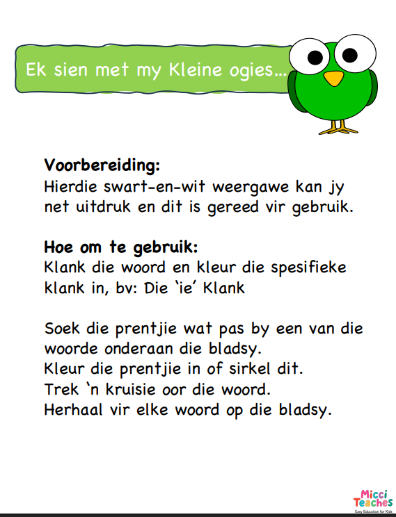 Soek die prentjie wat pas by een van die woorde onderaan die bladsy. Kleur die prentjie in of sirkel dit. Trek ‘n kruisie oor die woord. Herhaal vir elke woord op die bladsy.