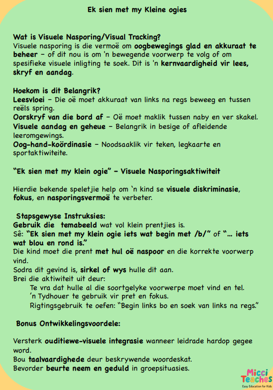 Visuele nasporing is die vermoë om oogbewegings glad en akkuraat te beheer of dit nou is om ‘n bewegende voorwerp te volg of om spesifieke visuele inligting te soek. Dit is ‘n kernvaardigheid vir lees, skryf en aandag. Hoekom is dit Belangrik? Leesvloei – Die oë moet akkuraat van links na regs beweeg en tussen reëls spring. Oorskryf van die bord af – Oë moet maklik tussen naby en ver skakel. Visuele aandag en geheue – Belangrik in besige of afleidende leeromgewings. Oog-hand-koördinasie – Noodsaaklik vir teken, legkaarte en sportaktiwiteite. “Ek sien met my klein ogie” – Visuele Nasporingsaktiwiteit Hierdie…