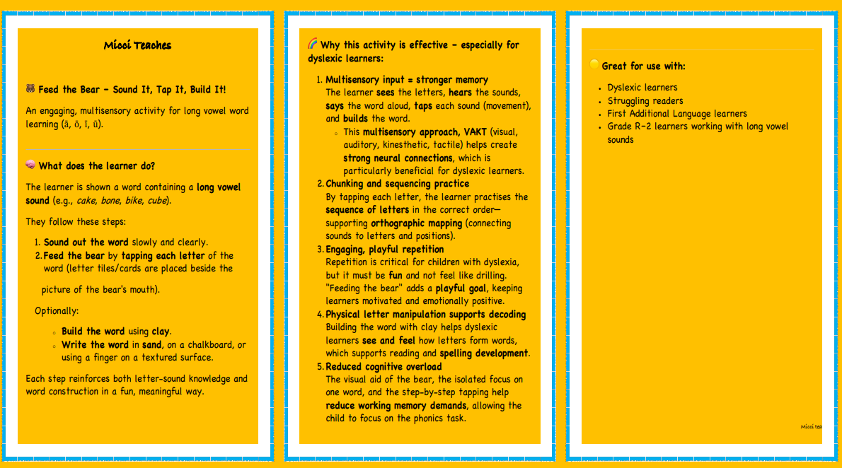 This multisensory approach, VAKT (visual, auditory, kinesthetic, tactile) helps create strong neural connections, which is particularly beneficial for dyslexic learners.