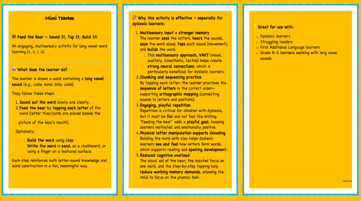 “Feeding the bear” adds a playful goal, keeping learners motivated and emotionally positive.