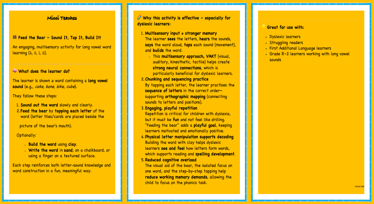 This multisensory approach, VAKT (visual, auditory, kinesthetic, tactile) helps createstrong neural connections, which is particularly beneficial for dyslexic learners.
