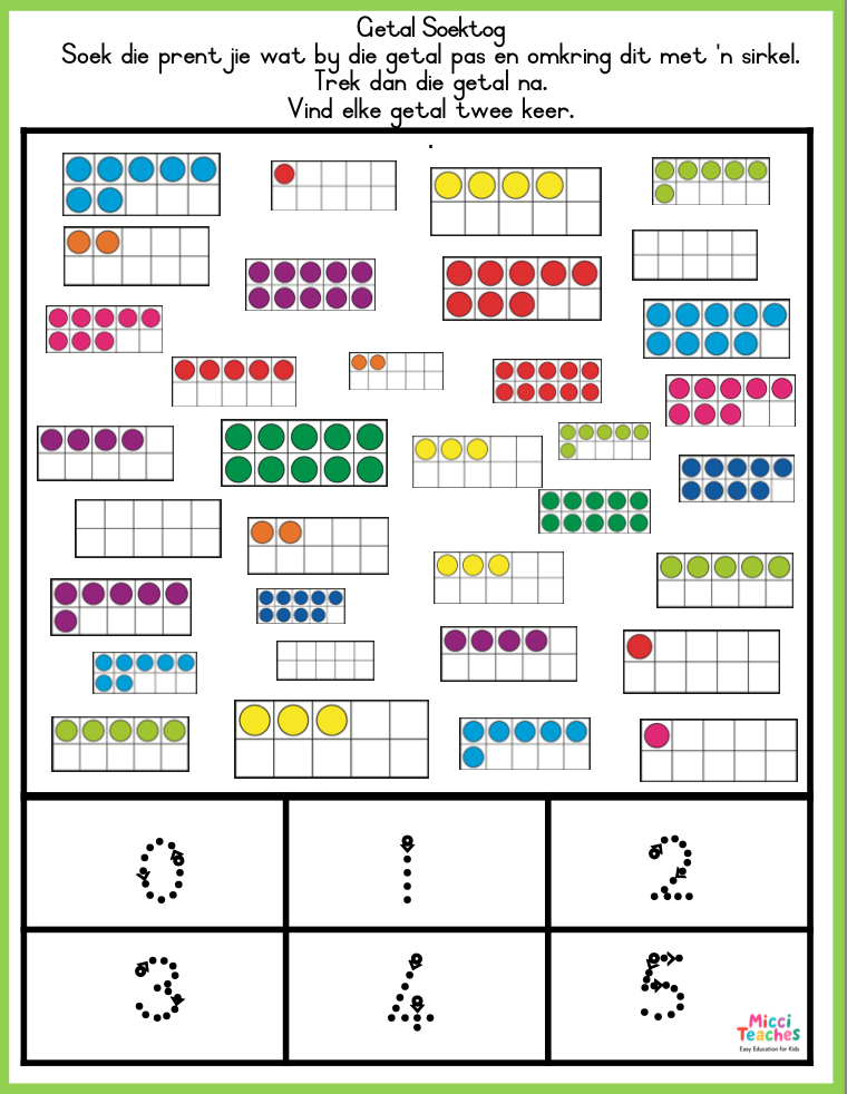 Soek die telraam wat ooreenstem met een van die getalle onder aan die bladsy. Kleur die prent in of sirkel dit. -Dit hang af of jy die kleur of swart-en-wit bladsy gebruik. Trek die getal na. Herhaal vir elke getal op die bladsy.