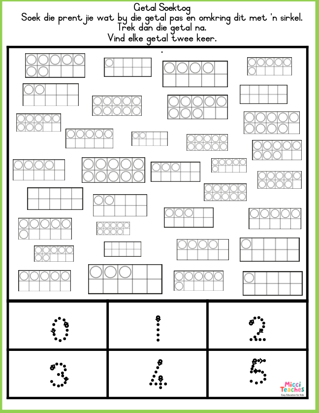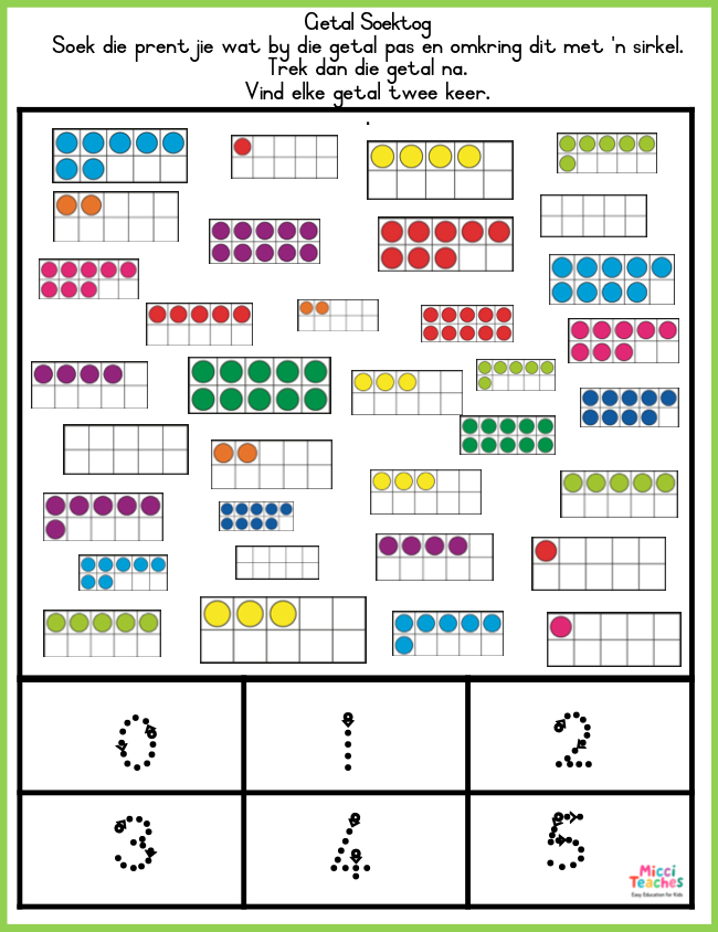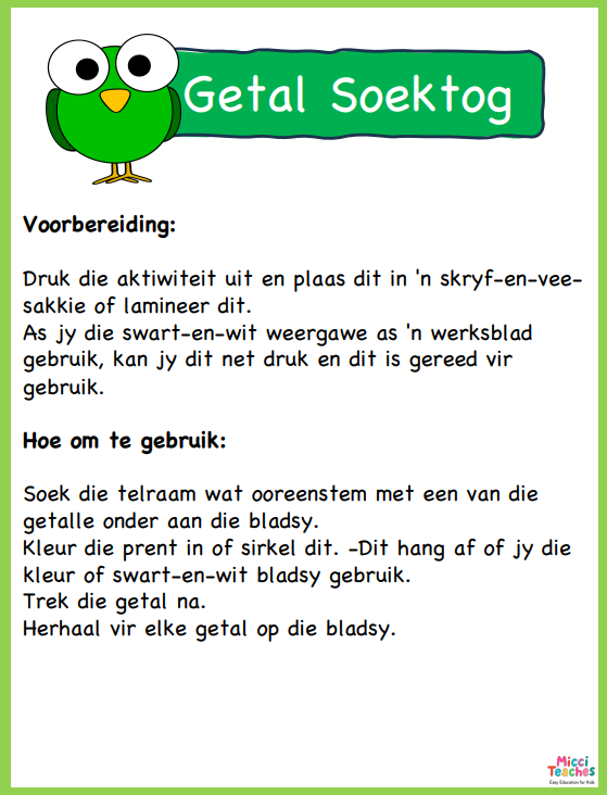 Soek die telraan wat ooreenstem met een van die getalle onder aan die bladsy. Kleur die prent in of sirkel dit. Dit hang af of jy die kleur of swart-en-wit bladsy gebruik. Trek die getal na. Herhaal vir elke getal op die bladsy.