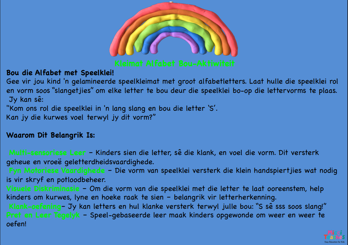 Kinders sien die letter, sê die klank, en voel die vorm. Dit versterk geheue en vroeë geletterdheidsvaardighede.