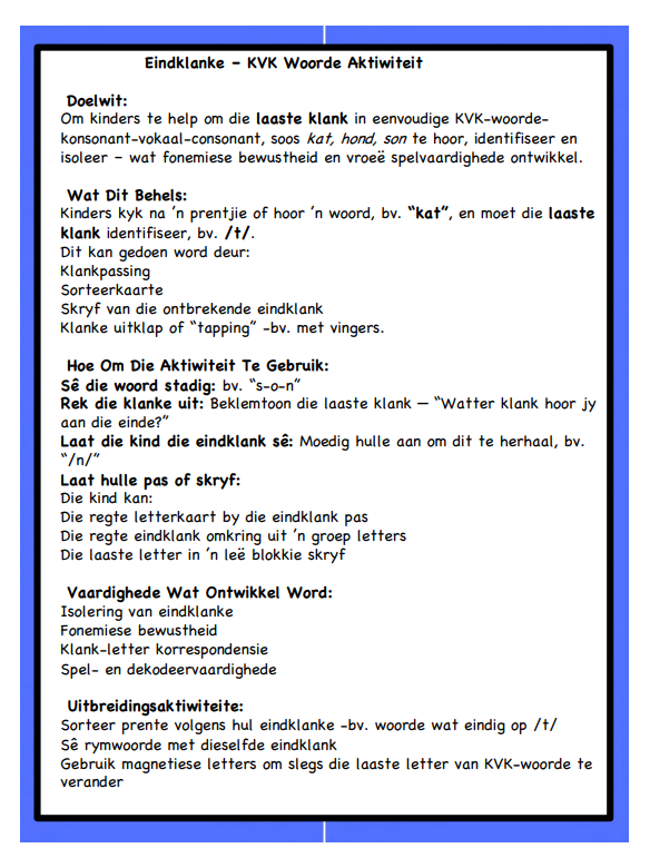 Rek die klanke uit: Beklemtoon die laaste klank — “Watter klank hoor jy