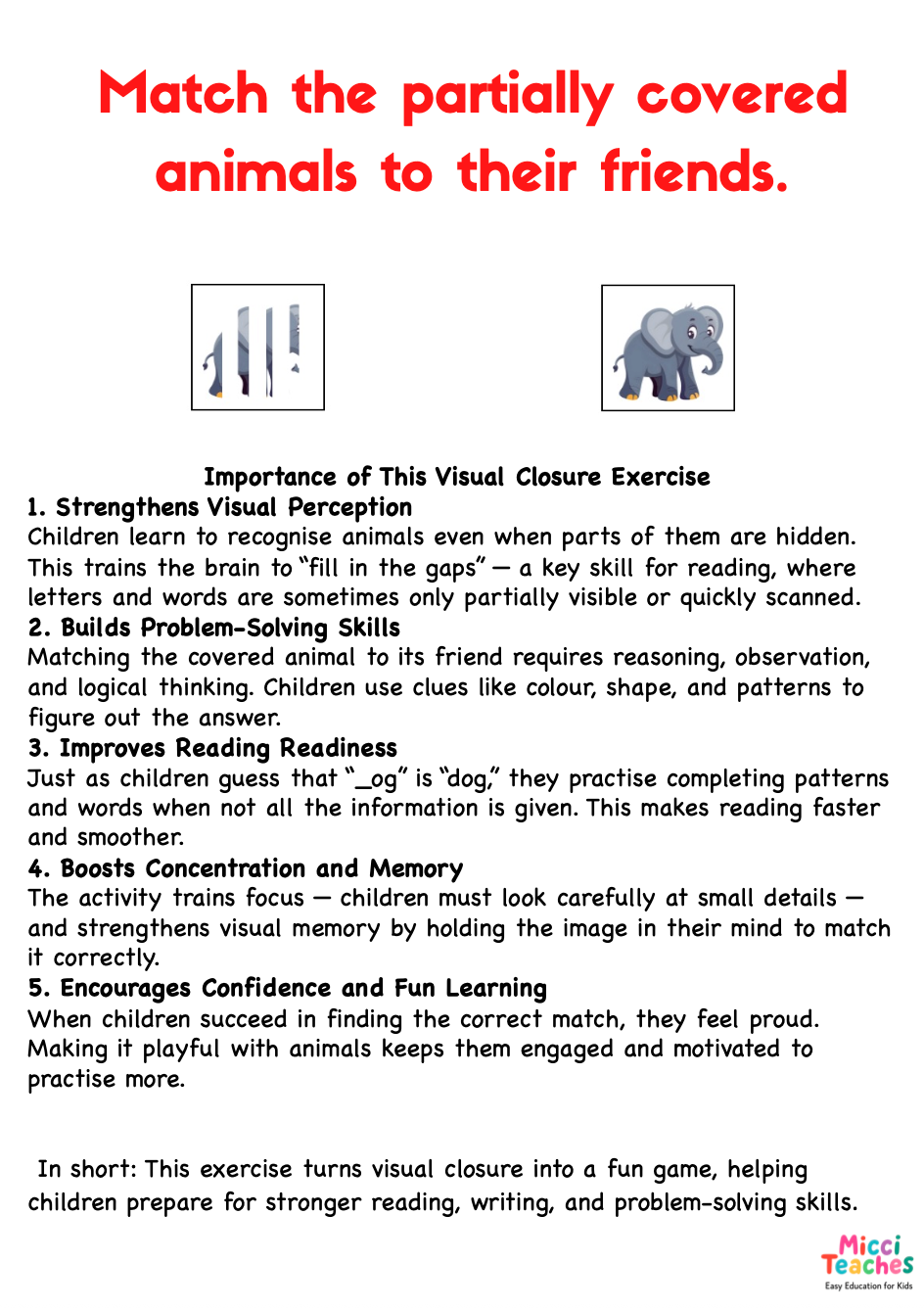 This exercise turns visual closure into a fun game, helping children prepare for stronger reading, writing, and problem-solving skills.