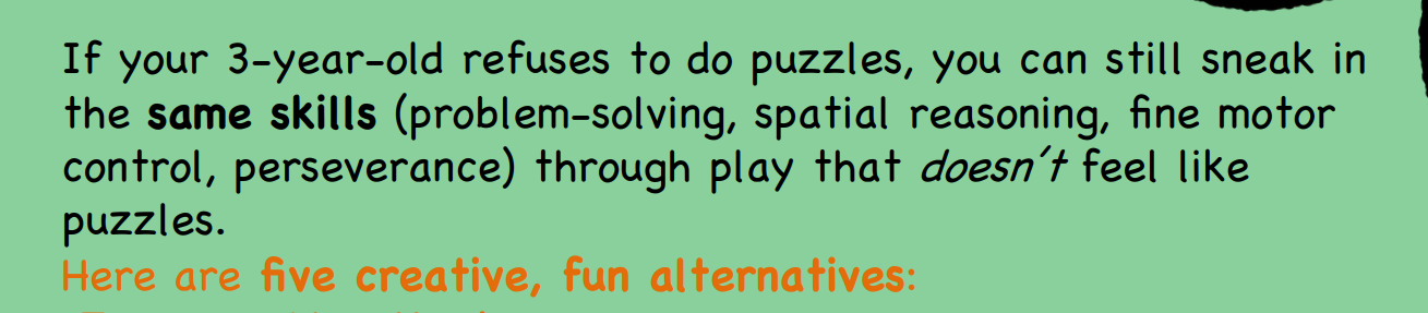As jou 3-j4 arige weier om legkaarte te bou, kan jy steeds dieselfde vaardighede (probleemoplossing, ruimtelike redenasie, fyn motoriese beheer, deursettingsvermoë) inkry deur speletjies wat nie soos legkaarte voel nie. Hier is vyf kreatiewe, prettige alternatiewe