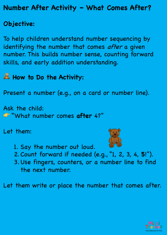 To help children understand number sequencing by dentifying the number that comes after a given number. This builds number sense, counting forward skills, and early addition understanding.