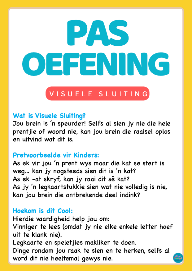 Visuele sluiting is van uiterste belang vir kinders omdat dit ’n grondslagvaardigheid is wat baie ander leer- en daaglikse funksies beïnvloed. Hier is hoekom: 1. Lees- en skryfontwikkeling Kinders moet woorde kan herken, selfs al sien hulle dit nie volledig nie. Byvoorbeeld, as ’n deel van ’n woord weg is of vinnig gelees word, help visuele sluiting die brein om die ontbrekende deel in te vul. Dit: verbeter leesvlotheid, verminder die behoefte om elke letter stadig te dekodeer, en bou selfvertroue by jong lesers. 2. Probleemoplossing en redenasie Visuele sluiting help kinders om patrone en logiese skakels te raai of…