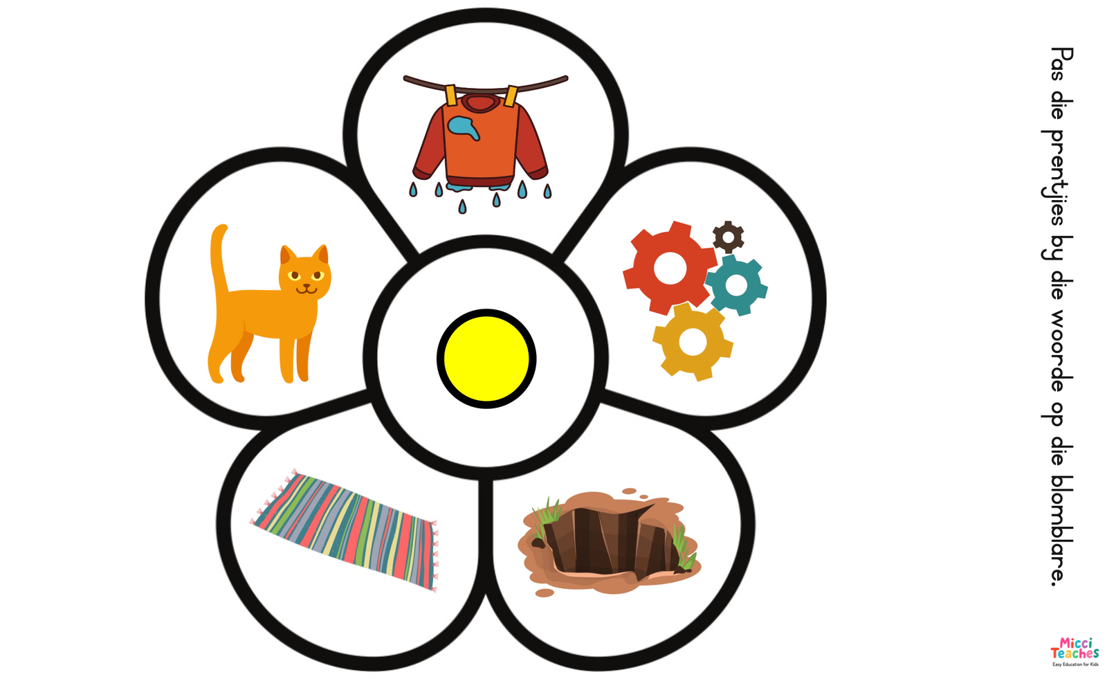 Kyk na die prentjie op die blom. Lees die woorde op die blomblare en plak dit op die prentjie. Jy moet die blomblare uitknip en plak.