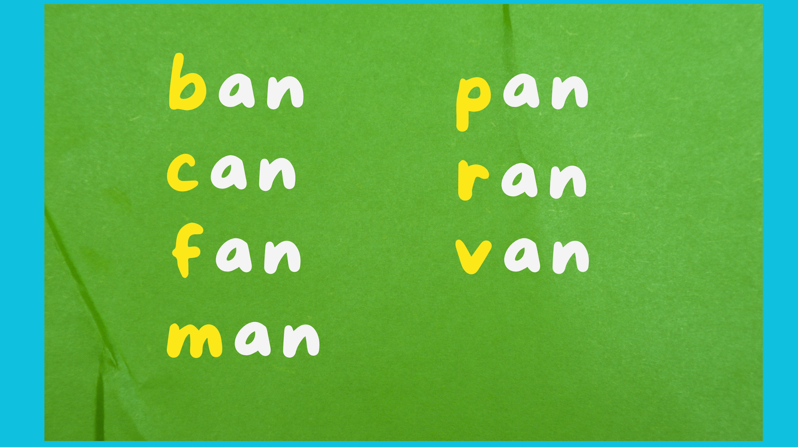 (at, ap, an, ig, oat, oo, un, en, ay, ch, op, ill), while also introducing 3–4 high-frequency sight words that are repeated throughout the lesson.