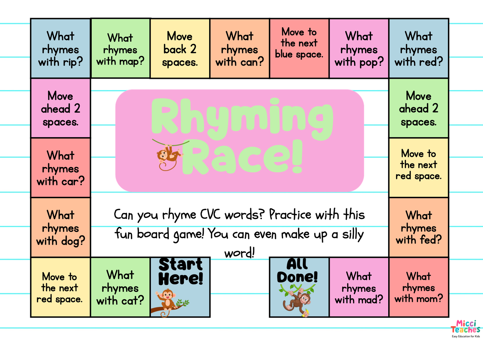 Practice rhyming with this fun and silly board game!