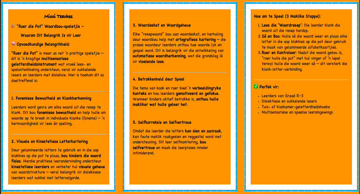 Leerders word gevra om elke woord uit die resep te klank. Dit bou fonemiese bewustheid en help hulle om woorde op te breek in individuele klanke (foneme) – ‘n kernvaardigheid vir lees én spelling.