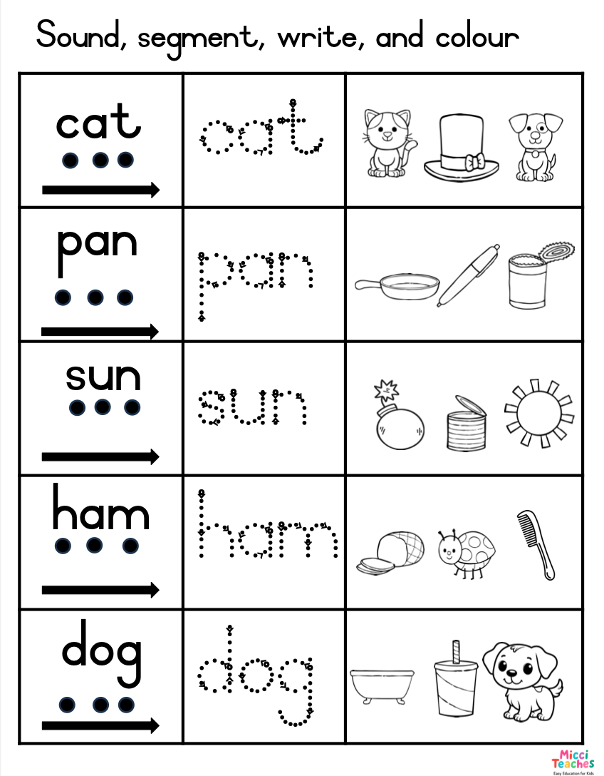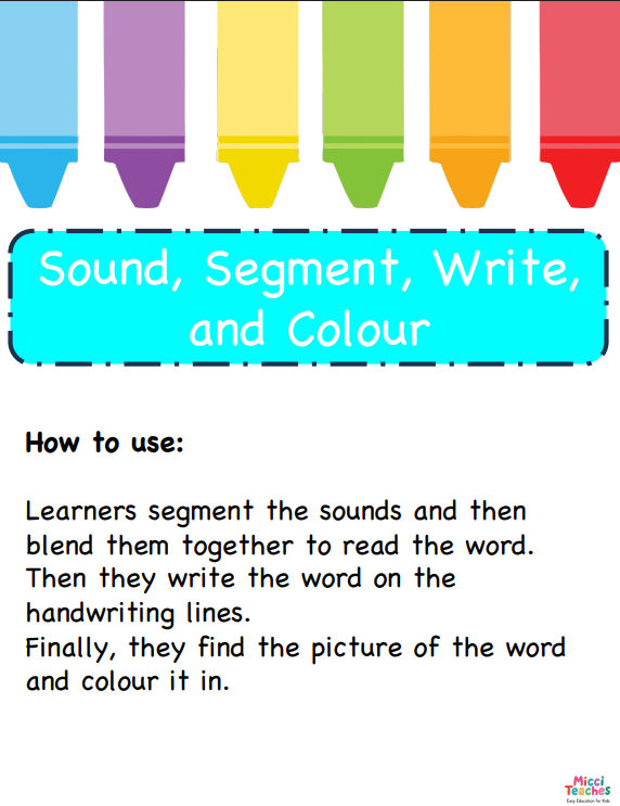 Learners segment the sounds and then blend them together to read the word. Then they write the word on the handwriting lines. Finally, they find the picture of the word and colour it in.