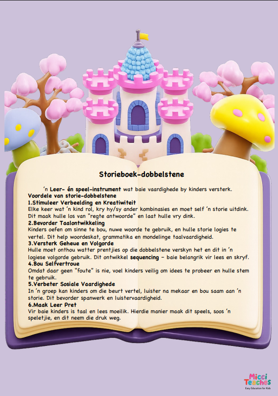 Kinders oefen om sinne te bou, nuwe woorde te gebruik, en hulle storie logies te vertel. Dit help woordeskat, grammatika en mondelinge taalvaardigheid. Bevat drie kleurvolle dobbelstene om stories te vertel!