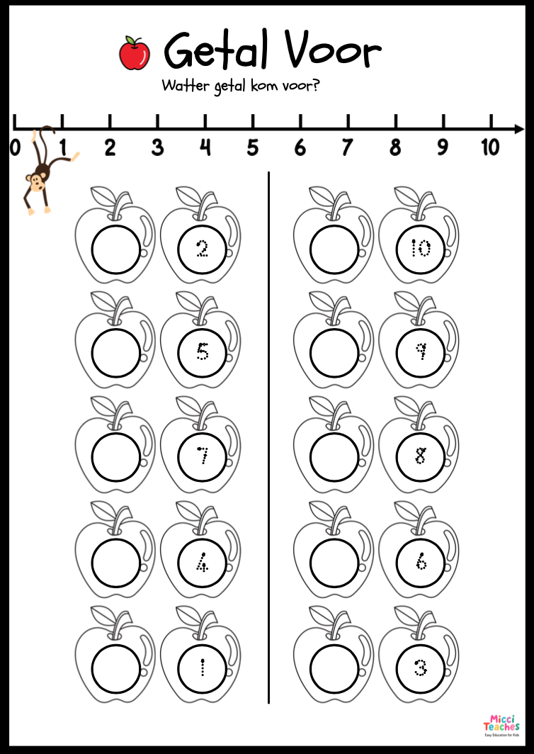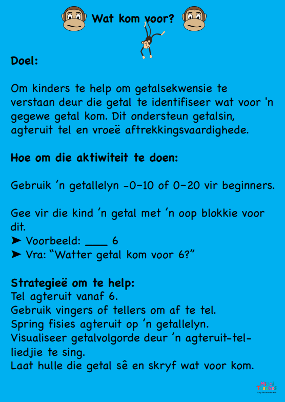Om kinders te help om getalsekwensie te verstaan deur die getal te identifiseer wat voor gegewe getal kom. Dit ondersteun getalsin, agteruit tel en vroeë aftrekkingsvaardighede.